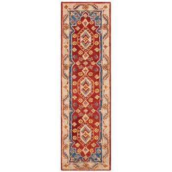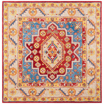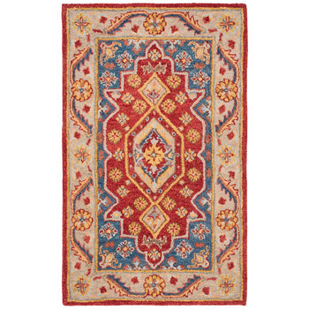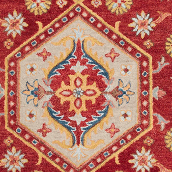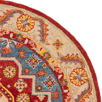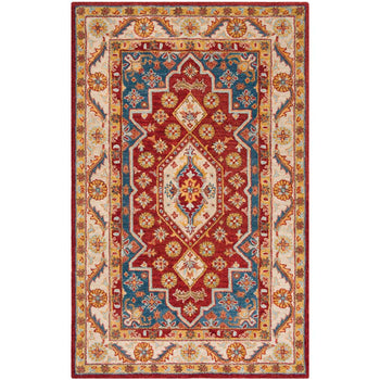 Adorn your space with a rug that boasts a vibrant palette, dominated by bold reds that exude energy and warmth, contrasted by serene blues that infuse a sense of calm and sophistication. The timeless pattern, captured from the provided image, showcases a harmonious blend of ornate floral and geometric motifs, creating a stunning visual symphony that commands attention and complements a variety of interior decors.