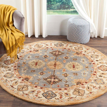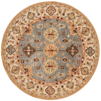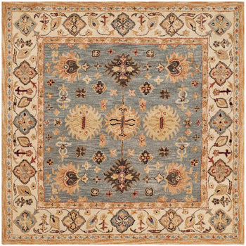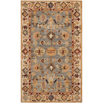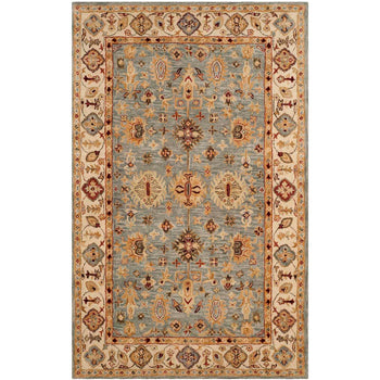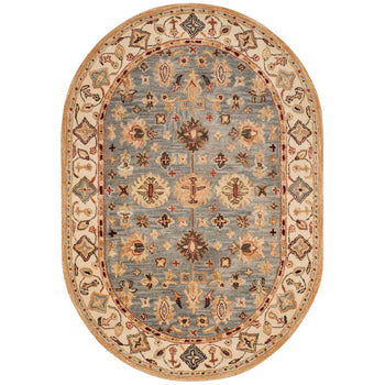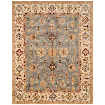 Design your home with the captivating patterns displayed on this rug; intricate floral and geometric motifs that create a harmonious aesthetic. The serene blue backdrop is adorned with ivory accents, alongside hints of warm golds, tans, and deep reds, yielding a sophisticated color palette that complements both modern and classic interiors.