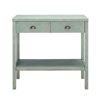 A striking statement piece designed to elevate the decorative drama of any living space, this Asa Console Table is a masterclass in fearless modern style. Asa's turquoise green frame is distinct and dynamic with an overall crosshatch pattern, and the antique gold half-moon pulls on its two drawers will make you look twice.