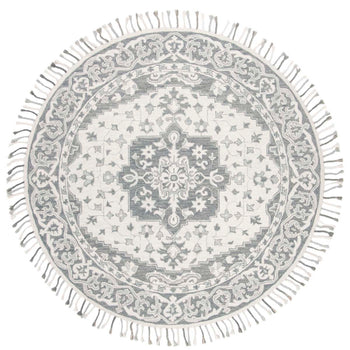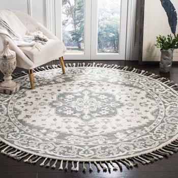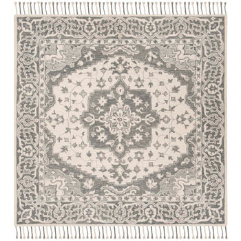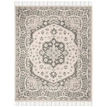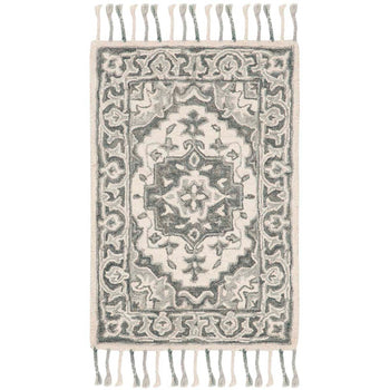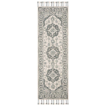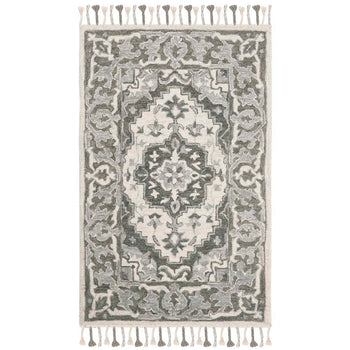 Add a touch of elegance to your home with this sophisticated 2'-3" X 5' accent area rug. Crafted using a hand-tufted technique in India, this piece is a testament to exquisite craftsmanship. Its plush 1/2" pile height offers a comfortable underfoot experience, while the high-quality wool ensures durability and longevity. Flaunting a captivating grey and light grey color palette, this rug showcases a timeless pattern that combines classical charm with a modern aesthetic. The intricate design, reminiscent of traditional motifs with a contemporary twist, elevates any room, seamlessly integrating with a variety of decor styles. Complete with delicate fringe details, it promises to be a statement piece in your living space.