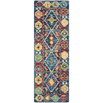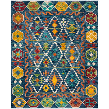 Boasting a rich navy base complemented by gold accents, the design resonates with a blend of traditional and contemporary styles. The intricate pattern showcases symmetrical medallions and geometric shapes, bringing an orderly yet dynamic visual appeal to your living space. Each shape is thoughtfully colored, incorporating shades of red, green, and blue, that converge harmoniously to create a captivating visual feast.