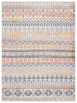 The rug boasts a dynamic blend of IVORY, BLUE, and RUST hues, with a delightful pattern that is sure to captivate the eye. Its 3/8" pile height offers a delightful underfoot feel, striking the perfect balance between comfort and easy maintenance.