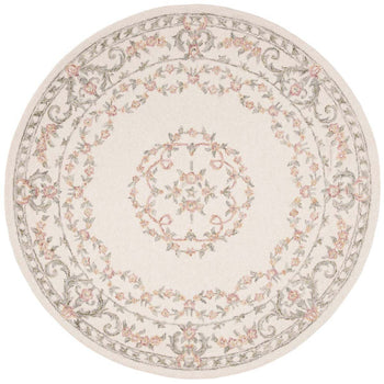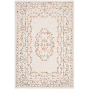 Crafted to perfection in India, the rug showcases a stunning ivory base color with romantic accents in soft pink, creating a soothing palette that complements a variety of decors. The intricate pattern, as visible in the image, features a traditional floral motif that exudes a timeless charm, with each detail meticulously tufted by skilled artisans.
