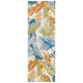 The lush green and radiant gold tones intertwine with tropical leaf patterns, creating a vibrant yet harmonious aesthetic that effortlessly captures the essence of both indoor and outdoor decor. Constructed from a premium blend of 76% Polypropylene and 23% Polyester with 1% backing material, this runner offers durability against the elements while maintaining a soft touch underfoot.
