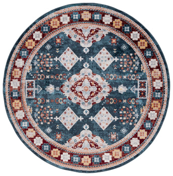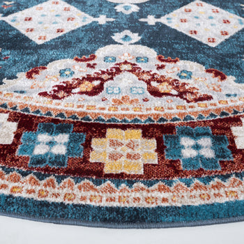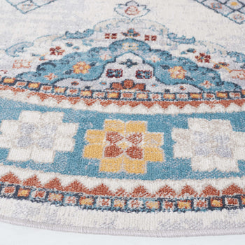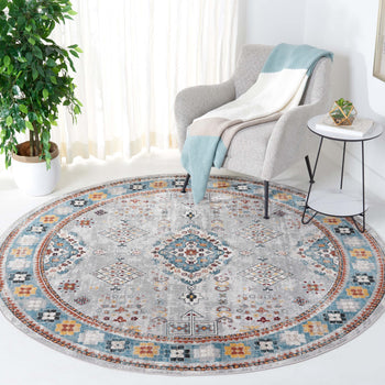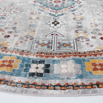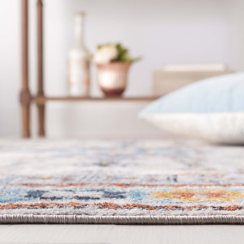 The rug's intricate pattern, as displayed in the image, showcases a harmonious blend of grey and blue hues, complemented by accents of warm reds and calming neutrals. These colors create a rich tapestry of ornate medallions and floral motifs framed by a detailed border, which add a sense of depth and allure to your interior design.