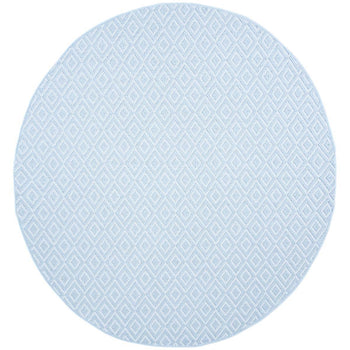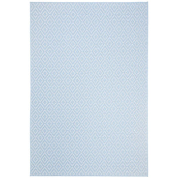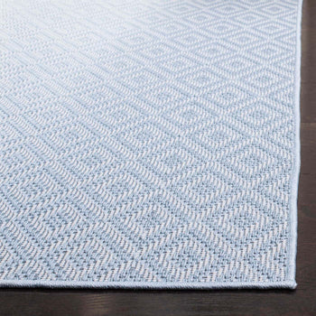 - The geometric pattern is masterfully woven using light blue and cream colors, inspired by the image provided, to create a harmonious design that complements a variety of decors.