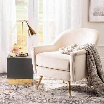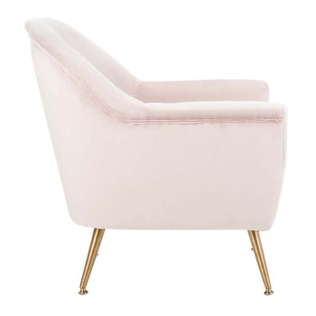 Update any living room with the fresh retro flair of this Brienne Mid Century Arm Chair. Brienne's plush blush pink velvet is paired with vintage style brass legs to create a luxuriously glam retreat for relaxing with an after work cocktail.