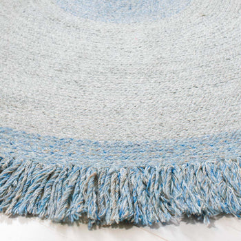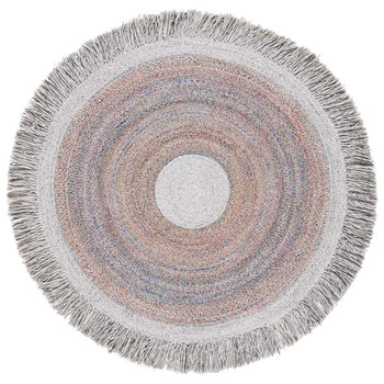 The rug's contemporary design features a unique pattern that seamlessly converges at the center, accentuating its round shape and providing a captivating focal point for your room. The fringe detailing along the perimeter adds a playful yet elegant touch that enhances the rug's visual appeal.