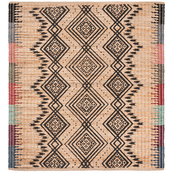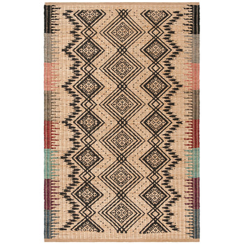 Embracing a fusion of natural and black hues, this runner features a symmetrical pattern with intricate diamond motifs that symbolize harmony and balance, echoing the rich cultural heritage of its artisans. The presence of subtle color accents in shades akin to terra cotta and serene blue enhances the visual appeal, infusing a whisper of color that complements a wide range of interior styles.