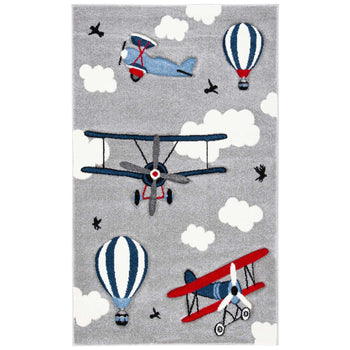Elevate your child's play area with our charming and playful accent rug, arriving in a convenient 2' 3" X 4' size. Crafted with expertise in Turkey, this rug displays a delightful aviation theme, featuring whimsical airplanes and hot air balloons gently adrift among fluffy clouds against a serene light grey backdrop. Pops of vibrant red add a dash of excitement, perfect for sparking your little one's imagination.