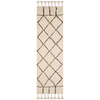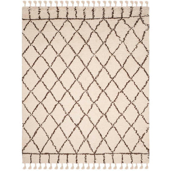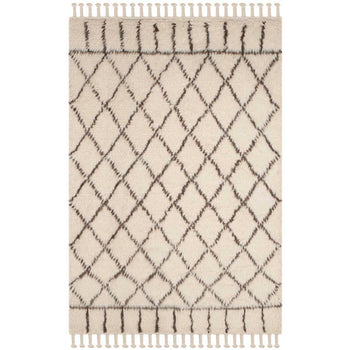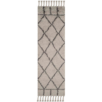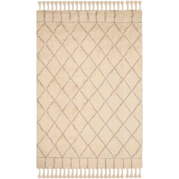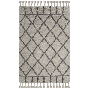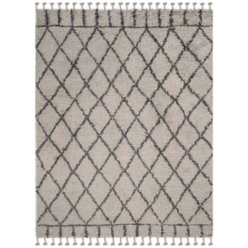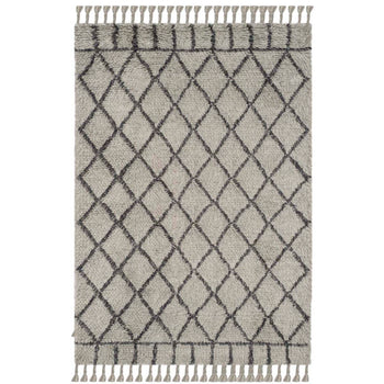 Adorned with a subtle yet chic ivory and light grey color palette, the design showcases a harmonious geometric diamond pattern that resonates with contemporary decor while paying homage to traditional design principles. The rug's inherent charm is amplified by the playful tassels that line its edges, adding a touch of whimsy to its sophisticated profile.