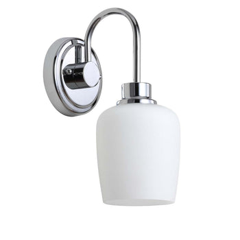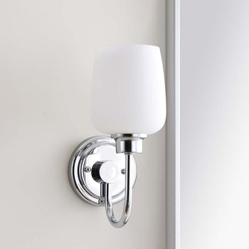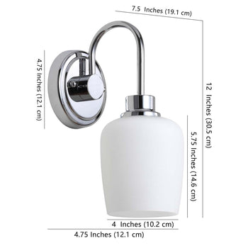 Brighten up any powder room with this polished bathroom sconce. A stunning chrome finish and sturdy metal construction make it a design investment, while an elegant white glass shade diffuses light upward for a radiant luminous glow.