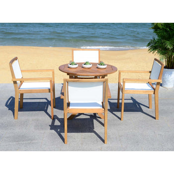 For endless fun in the sun look no further than this classic 5 piece dining set. A modern investment, its 34.5 round dining table and four ample chairs are crafted in a natural hue and feature timeless white upholstery. Designers love its versatility and value.