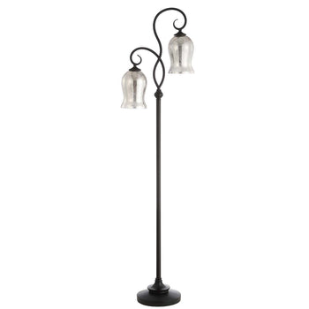 Delicate and demure, this gorgeous black floor lamp adds character and style to the living room. Its two lantern style hanging lamps were meticulously designed with two shimmering silver and ivory glass shades. Designers love its curved metal details.