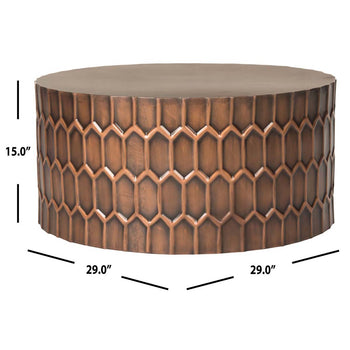 A vintage piece found one of London's premiere design galleries inspired this contemporary coffee table. Finished with a modern honeycomb design, its antique copper finish and generous circular figure bring the taste of a well traveled eye to any room.