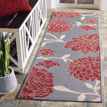 This particular rug features a striking pattern that exudes elegance and sophistication. The contrast between the anthracite base and the red floral motifs provides a classic yet contemporary ambiance that can elevate any space. The low pile height of 1/4 inch ensures it is easy to clean and maintain, perfect for both indoor coziness and outdoor resilience.