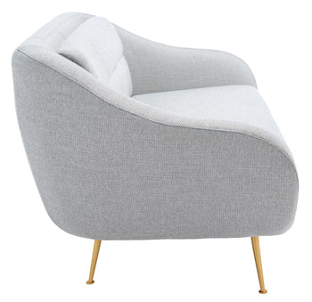 A glamorous icon of Mid-Century chic, this Belladonna Loveseat gives retro style a contemporary couture update. Belladonna's captivating curves and gold finished legs provide any decor a sense of depth and motion, while the light grey linen blend upholstery is luxuriously comfortable.