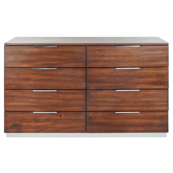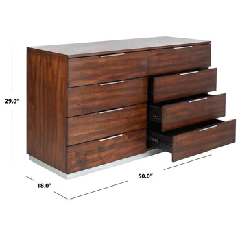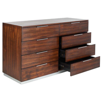 Designed to showcase the best of rustic warmth and contemporary chic, this Brylin 8 Drawer Dresser is a striking study in artistic contrasts. Brylin's dark walnut finish and acacia veneer beautifully juxtapose with its chrome plated metal pulls and plinth, making for a versatile look that's always in vogue.