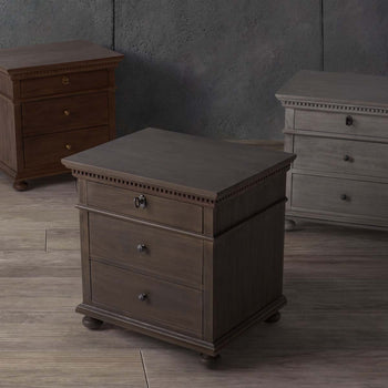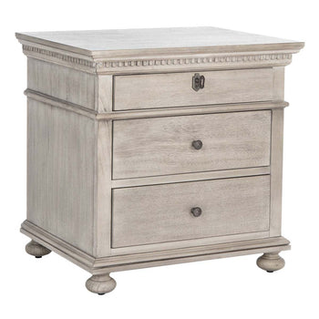 Styled after the one-of-a-kind antique furnishings in regal estates, this Allisyn Nightstand abounds with aristocratic allure. Allisyn's finely carved details and traditional bun feet are beautifully displayed in rich brown mahogany, while antiqued brass knobs complete the stately look.
