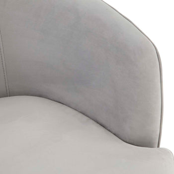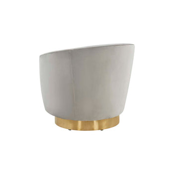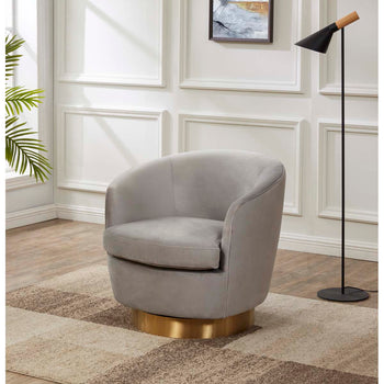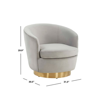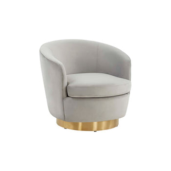 Revitalize any interior with the subtle, sophisticated glamour of this Annalee Swivel Chair. A low-slung reinterpretation of the wraparound tub silhouette, Annalee's plush light grey velvet upholstery is absolutely luxurious, and a gold stainless steel swivel base gives a touch of shimmer.