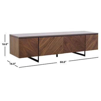 The contrasting wood grains of this Archie Chevron TV Stand transform decor into a high-fashion entertainment space. Finished in rich walnut with black iron hardware, Archie's four doors provide ample storage for media devices, consoles, and even your definitive collection of classic films.