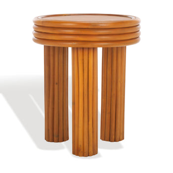 Embrace the eye-catching warmth and charm of our Bayard accent table. The table unites bold geometry and organic warmth of rattan in an artfully modern design. A round wooden tabletop sits upon chunky legs to make a stunning statement. Rattan poles adorn the facade to add linear character and texture to the table. Offering natural warmth and textures, our accent table thrives in a variety of settings. It can add character and charm to a sofa or armchair while offering the perfect perch to your decor items.