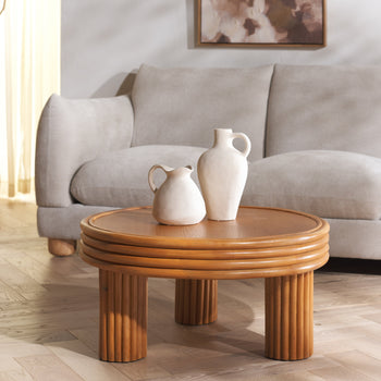 Liven up your space with the artful warmth and charm of our Bayard coffee table. The table unites bold geometry and organic warmth of rattan in an artfully modern design. A round wooden tabletop sits upon chunky legs to make a bold impact. Rattan poles adorn the facade to add linear character and texture to the table. Offering natural warmth and textures, our coffee table thrives in a variety of settings. It can set a stunning foundation for your beloved decor items in your lounge, bedroom, or home office.