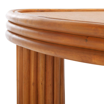 Embrace a warm and playful focal point with our Bayard coffee table. The table unites bold geometry and organic warmth of rattan in an artfully modern design. Its triangular tabletop is beautifully softened with curved edges. Perched upon three chunky cylindrical legs, our coffee table makes a stunning statement. Rattan poles adorn its facade to offer linear character and texture. Enriched with natural warmth and textures, our coffee table can serve as a stunning centerpiece in a cozy lounge, bedroom, or home office.