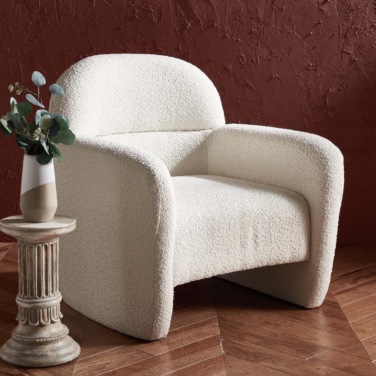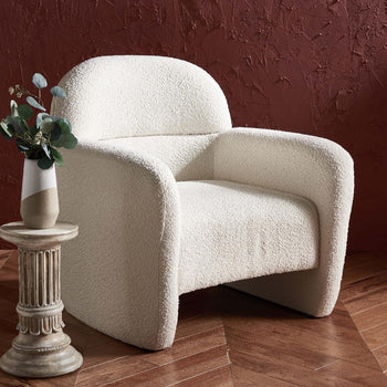 Embrace a stylish and comfy retreat with a Bellamaria accent chair. Our stunning chair packs warm and plush curves within a sleek and airy design. Its cushioned back and seat float between beautifully curved arms. The sensuous curves of the chair are accentuated by the rich and plush texture of boucle. Well-suited to being the center of attention, our accent chair delivers cozy comfort to become the perfect spot to read, relax, and lounge.