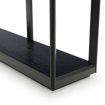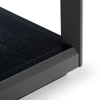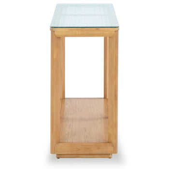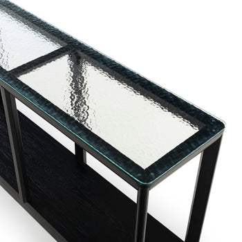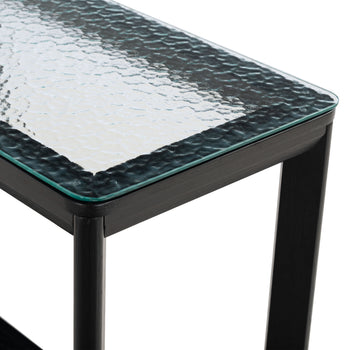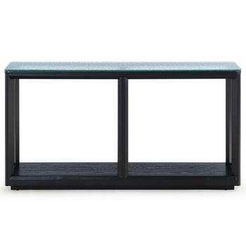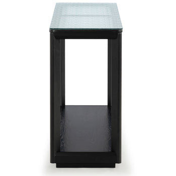 Introducing the Benecarlo Wood and Glass Top Console Table - a seamless blend of practicality and sophistication to elevate your space. Adorned in a classic black hue, this table has been meticulously crafted from solid rubber wood, known for its durability and eco-friendliness. The clear glass top provides not only an aesthetic appeal but also a sturdy, flat surface for your favorite decor pieces. The beauty of this console table lies in its simplicity and striking contrast between the black wood and clear glass. Whether you're after a table for your hallway, living room or any nook needing some style - the Benecarlo Wood and Glass Top Console Table is a perfect choice. Invest in this statement piece and add a modern touch to your home decor today.