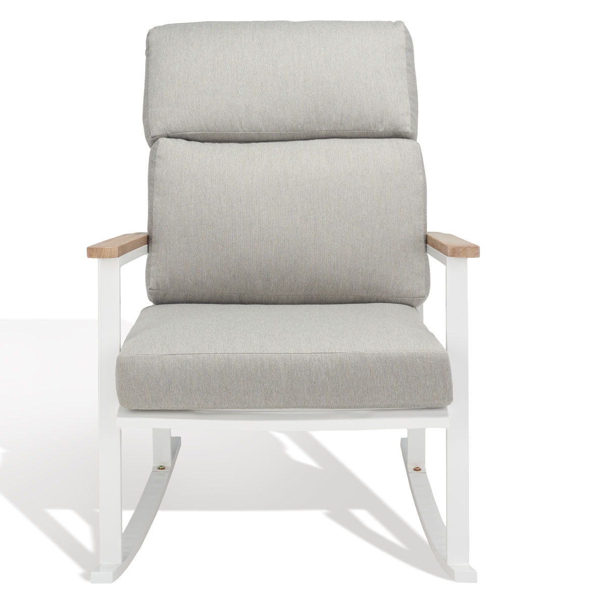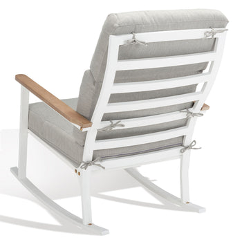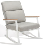 Soak in the sun or lavish in the shade with this timeless Brutus Rocking Chair. Flaunting a classic profile perfectly accented by natural eucalyptus armrests, Brutus offers lasting style and relaxation in its plush beige linen cushions.
