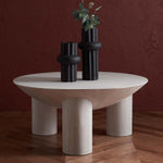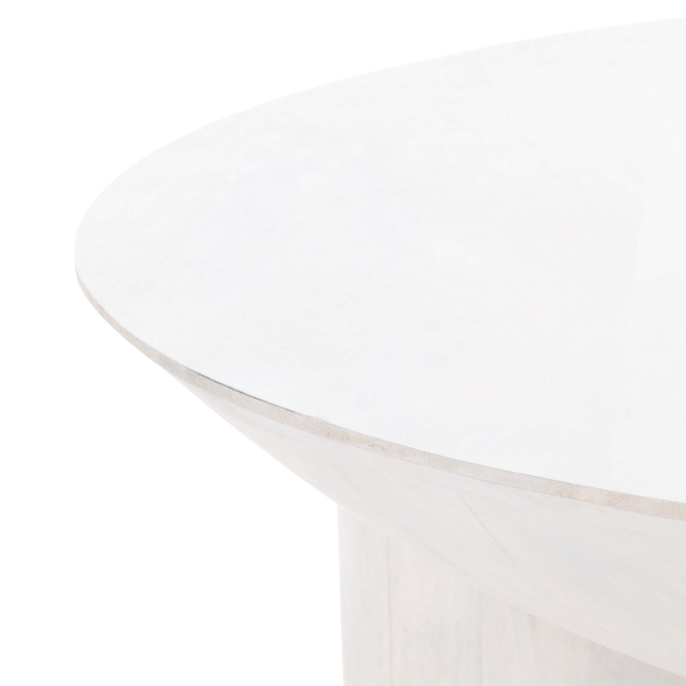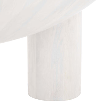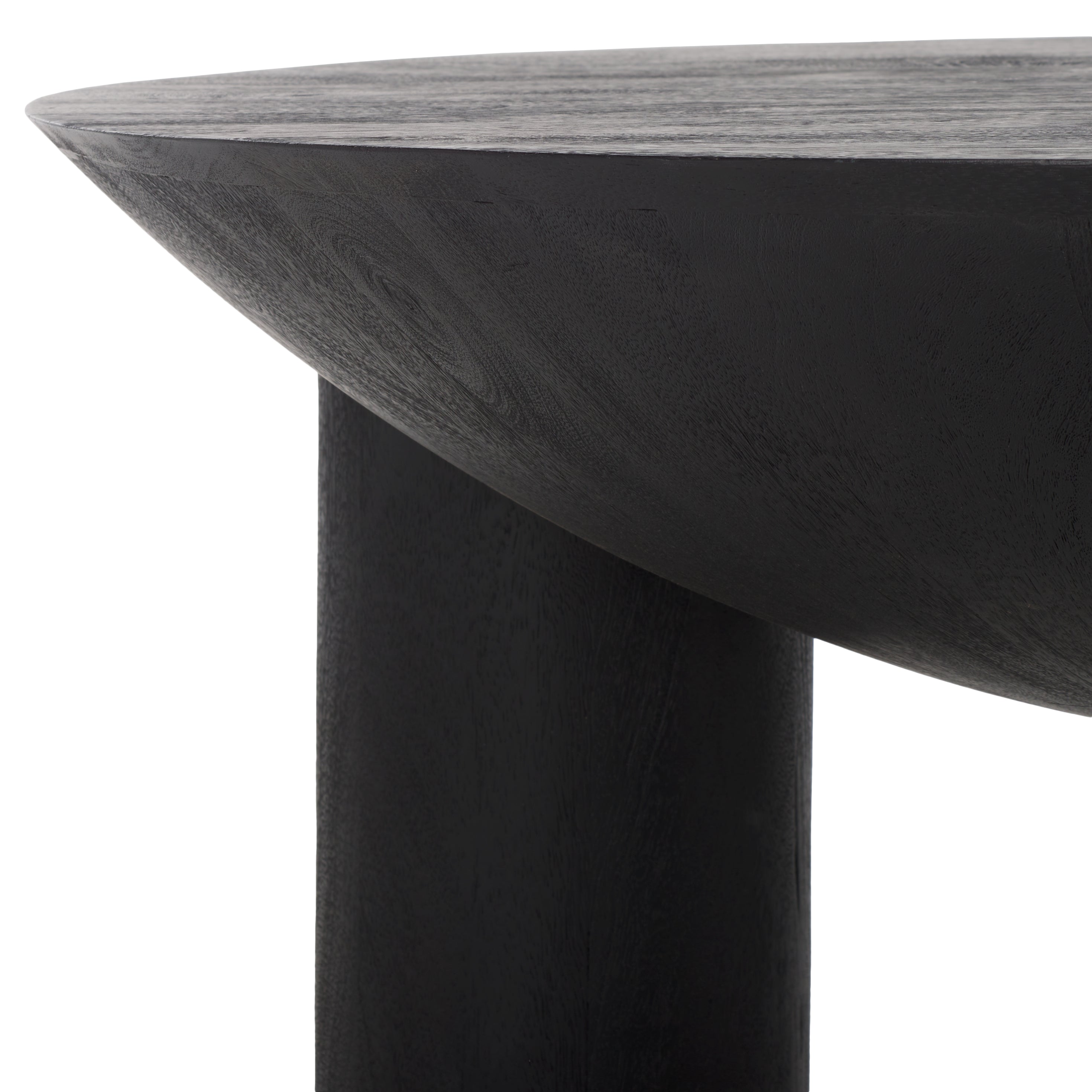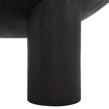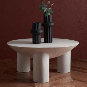Brighten up your home with the bold and playful design of the Calhoun round coffee table. Its eye-catching tabletop beautifully bulges and curves at the bottom to present a sculptural silhouette. It is perfectly complemented by three bold and chunky cylindrical legs. Our coffee table captivates the eye with its asymmetrical and playful design. Crafted with solid mango wood, the table is enlivened with the lively grains of the wood, creating a beautiful display of our favorite decor items.