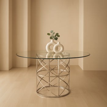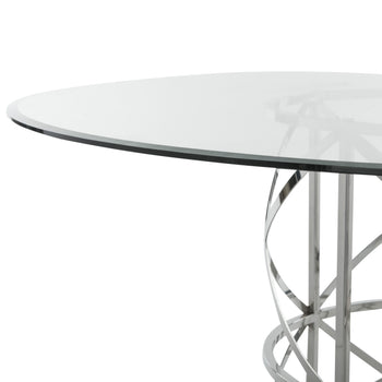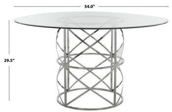 Introducing the Colbert 54" round glass top dining table in chrome, a perfect blend of modern elegance and functional design. This stunning piece features a sleek chrome base that adds a touch of shine to any dining space, offering a contemporary aesthetic that's sure to impress. The table's round beveled and tempered glass top provides a clear and spacious surface perfect for entertaining guests or enjoying intimate dinners with family and friends.