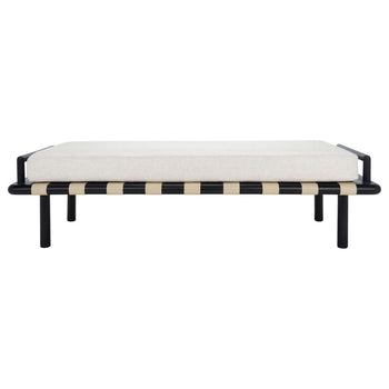 This Constantine Bench abounds with coastal elegance and tropical relaxation, making it a must-have for today's contemporary interiors. A natural teak frame is beautifully paired with woven top grain leather and a plush white linen-blend cushion, creating a luxurious perch in a hall, entry, or at the foot of a bed.