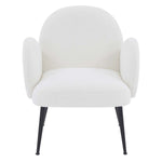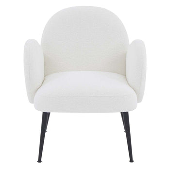 Embrace a plush and comfy retreat with our Crystalyn accent chair. Featuring a gracefully curved back and seat, the chair deems attention with its sumptuous and glamorous design. Its expertly tailored and generously padded seat is balanced with sleek metallic legs. Adorned in a classy ivory color and rich boucle texture, our accent chair is sure to enliven your home. Its plush and curvaceous cushioning is the perfect invitation to read, relax, and lounge.