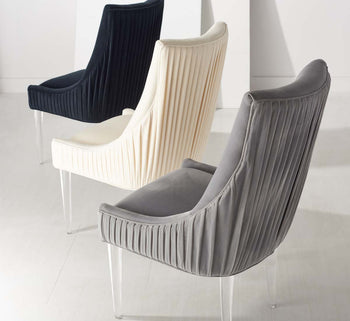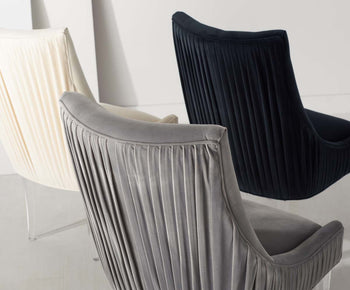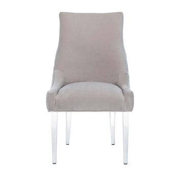 Feel the embrace of modern luxury with this contemporary acrylic leg dining chair. Its classic barrel back design features upholstery in a soothing pale taupe hue that instantly updates any room with its burst of color. Designers love its sleek acrylic legs.