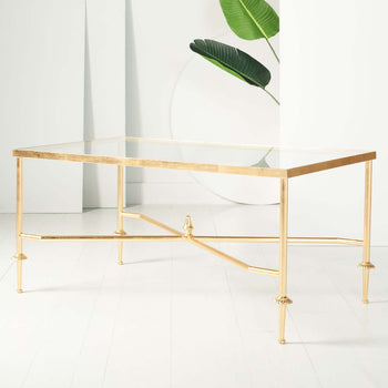 Victorian elegance meets contemporary sophistication in this striking Devi Coffee Table. Devi flaunts a finely detailed finial on its trestle and sculptural accents on airy slender legs, a gold leaf finish glimmering glamorously beneath a smooth glass top.