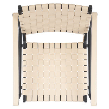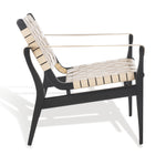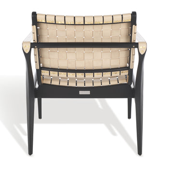 A familiar classic refreshed for the modern aesthetic, the Dilan Safari chair combines cherry mahogany with upholstery of woven leather straps on its back, seat and arms. Beautifully turned legs and curved seat base recall Mid-century Danish modern style.