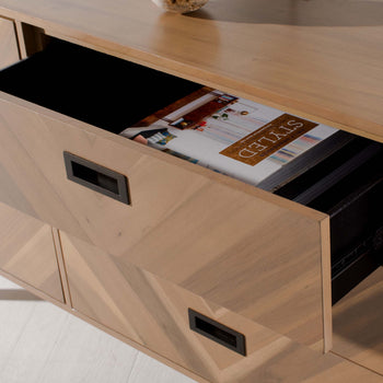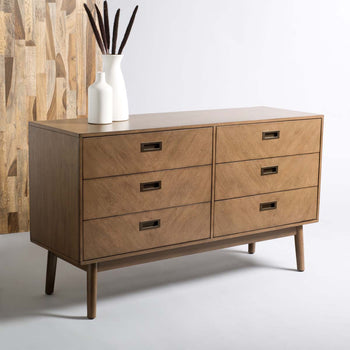 Mid Century chic meets contemporary class in this sophisticated Donald 6 Drawer Dresser. The herringbone inspired pattern on Donald's solid wood frame in a dark walnut finish with an acacia veneer makes for a look that's always in vogue. Subtle bronze pulls add a soft, glamorous touch.