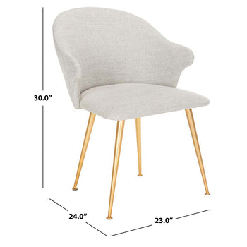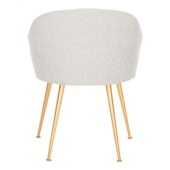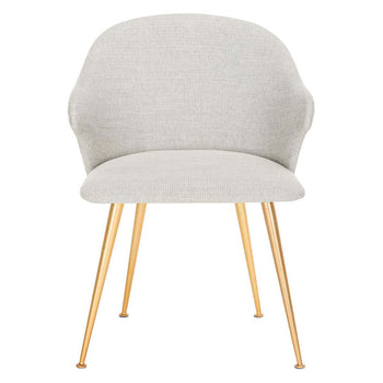 Inspired by vintage Italian style, this contemporary linen blend arm chair is a glamourous addition to any living room or dining room. Designed with a soft, generous seat, its soothing light grey upholstery complements its luxurious gold finished capped legs.