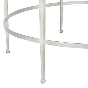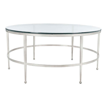 Divinely sophisticated in its understated elegance, this Edmund Cocktail Table is the perfect piece to balance any living room. The antique gold gilt finish on Edmund's open circular frame adds a glimmering touch to surrounding decor, and a clear glass top enhances its airy appeal.