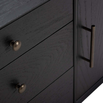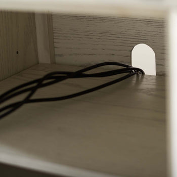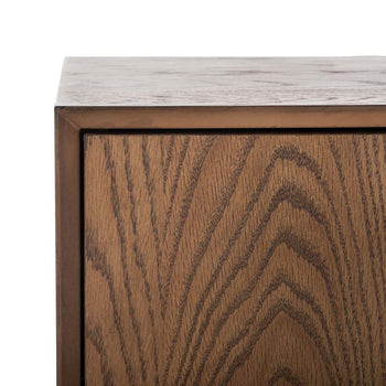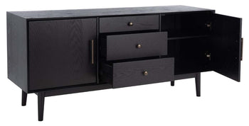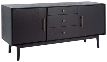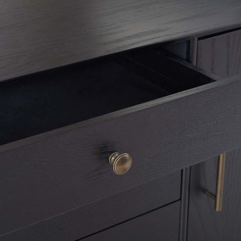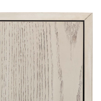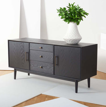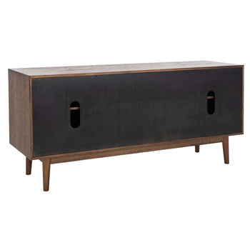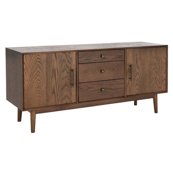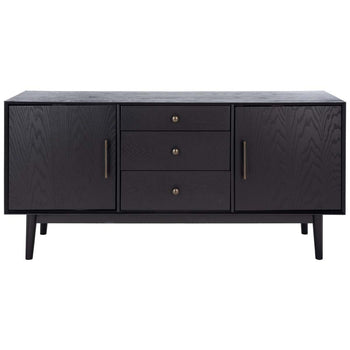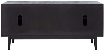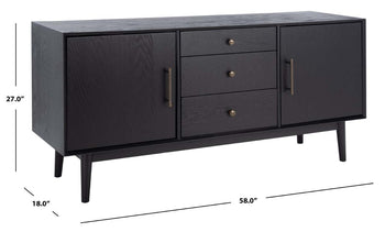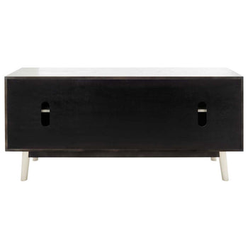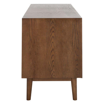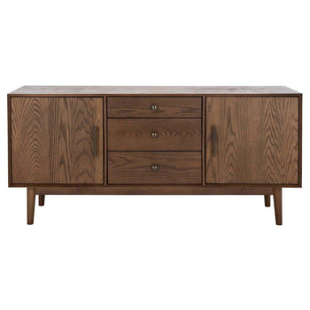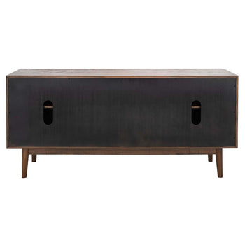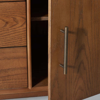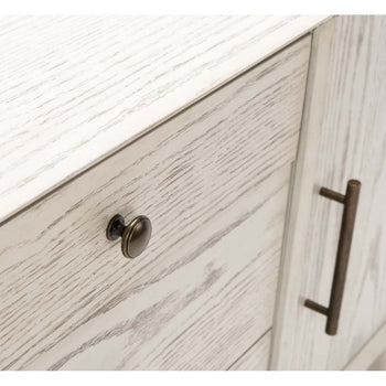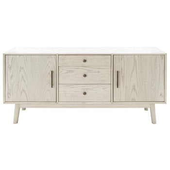 Transform your entertainment space with the retro-chic flair of this Elissa Mid-Century Media Stand. Two doors and three drawers provide plentiful yet discrete storage, while a soft whitewash finish and rich oak veneer are elegantly enhanced by contemporary bronze hardware.