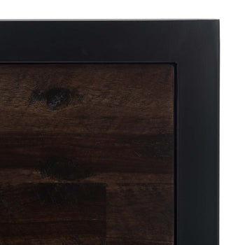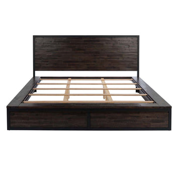 Modern minimalism at its luxurious finest, this Emmarose Storage Platform Bed elevates any bedroom’s aesthetic with style and substance. Emmarose features two discreet drawers for under the bed storage. Chocolate brown acacia wood and black iron frame make it a favorite of penthouse designers. Sized for a standard king bed. No box spring required.