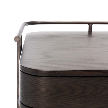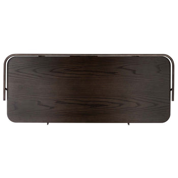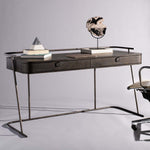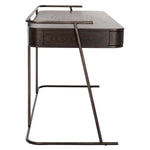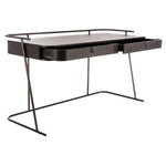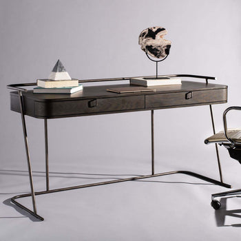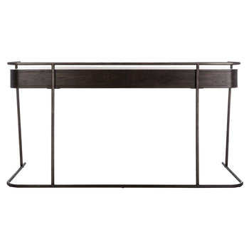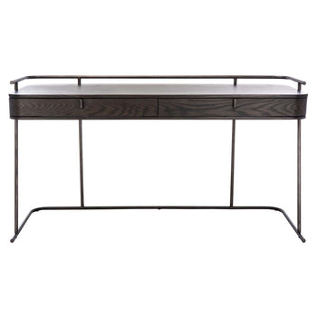 Paying tribute to the grand private study, this Ferrell Modern Desk showcases the stylish look of negative space with its streamlined black steel frame. Curved corners and subtle angles give Ferrell additional decorative depth, with a deep oak veneer bringing high class grandeur to home decor. Ferrell offers two slim drawers for discreet and convenient storage.