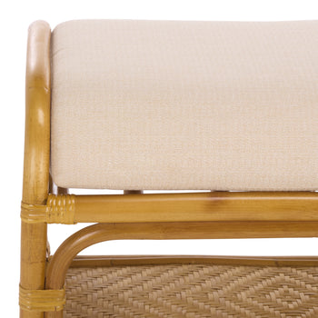 Introducing the Flanders rattan pole bench, where nature meets elegance in your living space. Crafted with an exquisite blend of wood, rattan pole, bamboo weaving, fabric, and foam, this bench embodies a harmonious fusion of materials and design. Its natural and white color palette effortlessly complements any decor, adding a touch of sophistication to your home. The Flanders rattan pole bench is perfect for elevating your porch, living room, or bedroom with its unique style and functionality. The natural wood frame paired with intricately woven bamboo and rattan create a stunning visual appeal, while the cushioned seat ensures comfort during moments of relaxation. Whether you're enjoying a quiet read or catching up with friends, this bench invites warmth and charm into your space, effortlessly becoming a centerpiece. Embrace the tranquil beauty of nature indoors with this thoughtfully designed piece. Experience the perfect blend of style and comfort with the Flanders rattan pole bench.