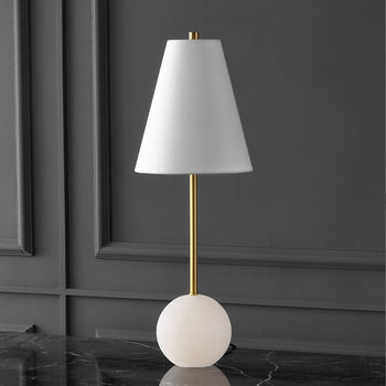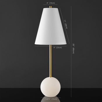 Uplift your decor with the striking simplicity and charm of our Genesis table lamp. Sleek proportions and contrasting geometry make our table lamp a welcoming and sophisticated addition to any tabletop. A stunning spherical base in white alabaster adds visual interest and elegance to its slender profile. Finished off with a white empire shade and gold hardware, our fashionable and space-friendly table lamp remains the perfect tool for styling a compact nightstand, side table, or credenza.