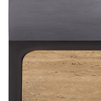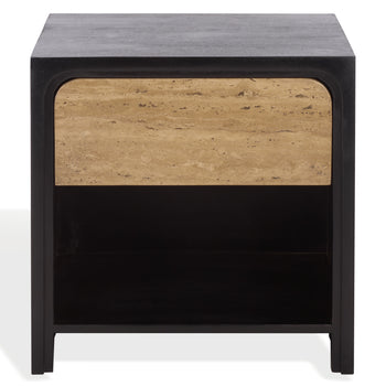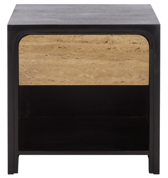 Elevate your bedroom aesthetic with the Halcyon travertine drawer nightstand in stunning black and travertine. This sophisticated piece seamlessly blends natural and modern elements, creating a harmonious balance in your space. Crafted from sleek wood and robust metal, this nightstand offers both style and functionality. The travertine surface adds a touch of elegance, making it the perfect accent for any decor. The spacious drawer provides an ideal solution for all your bedside essentials, ensuring everything is within easy reach. Whether you are catching up on late night reading or settling in to relax, this nightstand complements your routine effortlessly. Its sleek black and travertine finish creates a versatile piece that fits seamlessly with your existing decor. Transform your sleeping area with the understated charm and practicality of the Halcyon travertine drawer nightstand.