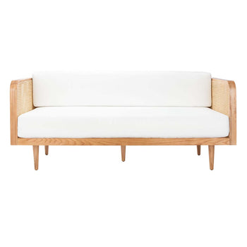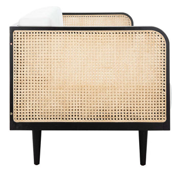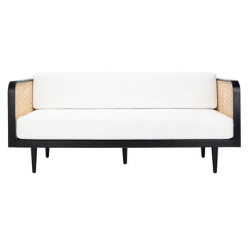 For the daydreamer longing for an afternoon repose, the Helena French Cane Daybed responds with the luxurious look of coastal lifestyle decor. Ivory linen cushions make for a comfort soft feel while its black ash frame draw attention to its sublime natural toned French cane sides and back. The perfect piece for adding breezy style to fashionable decor.