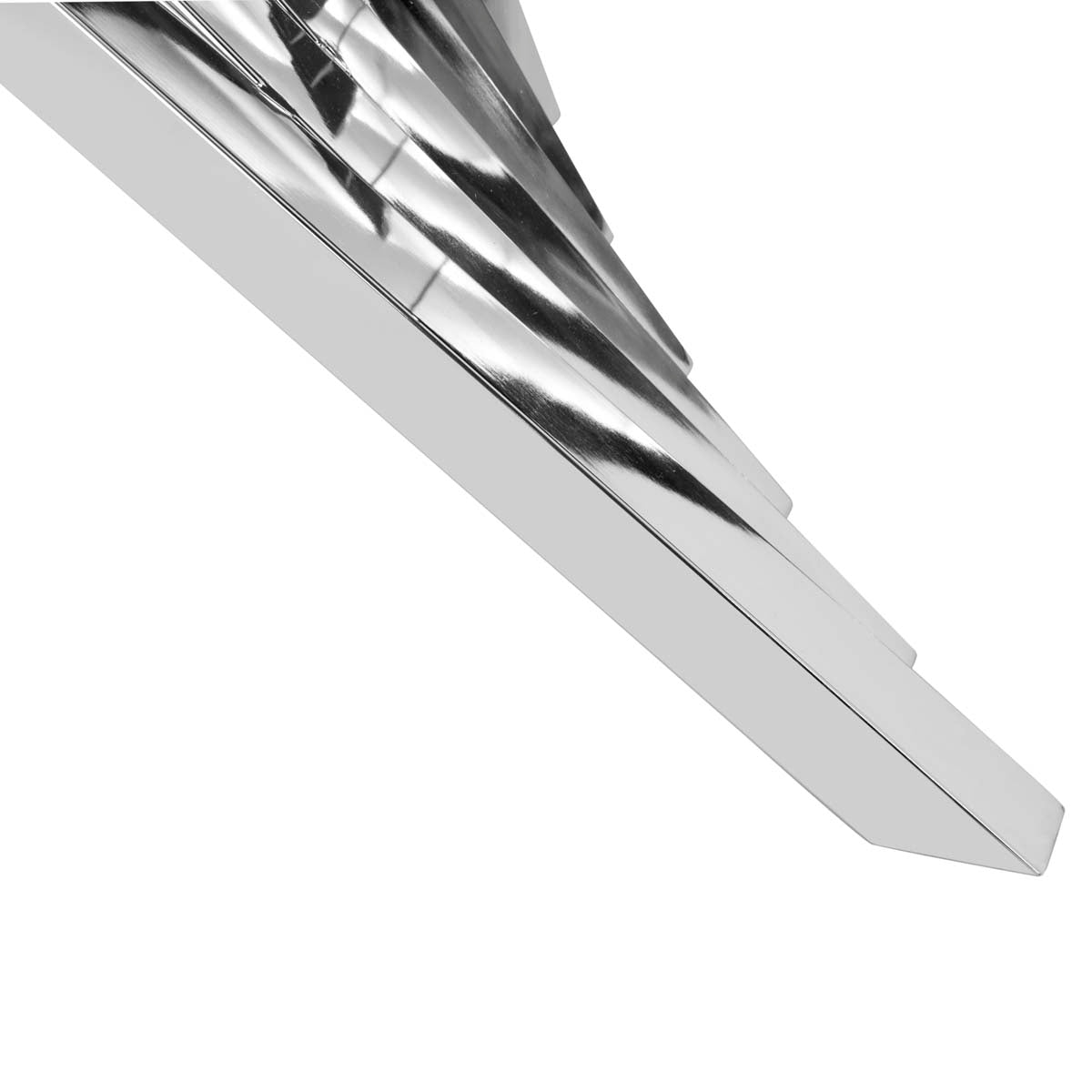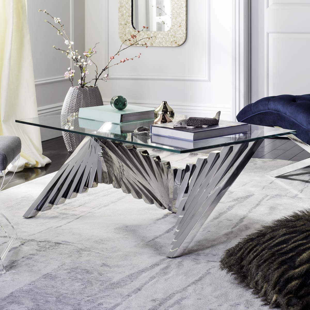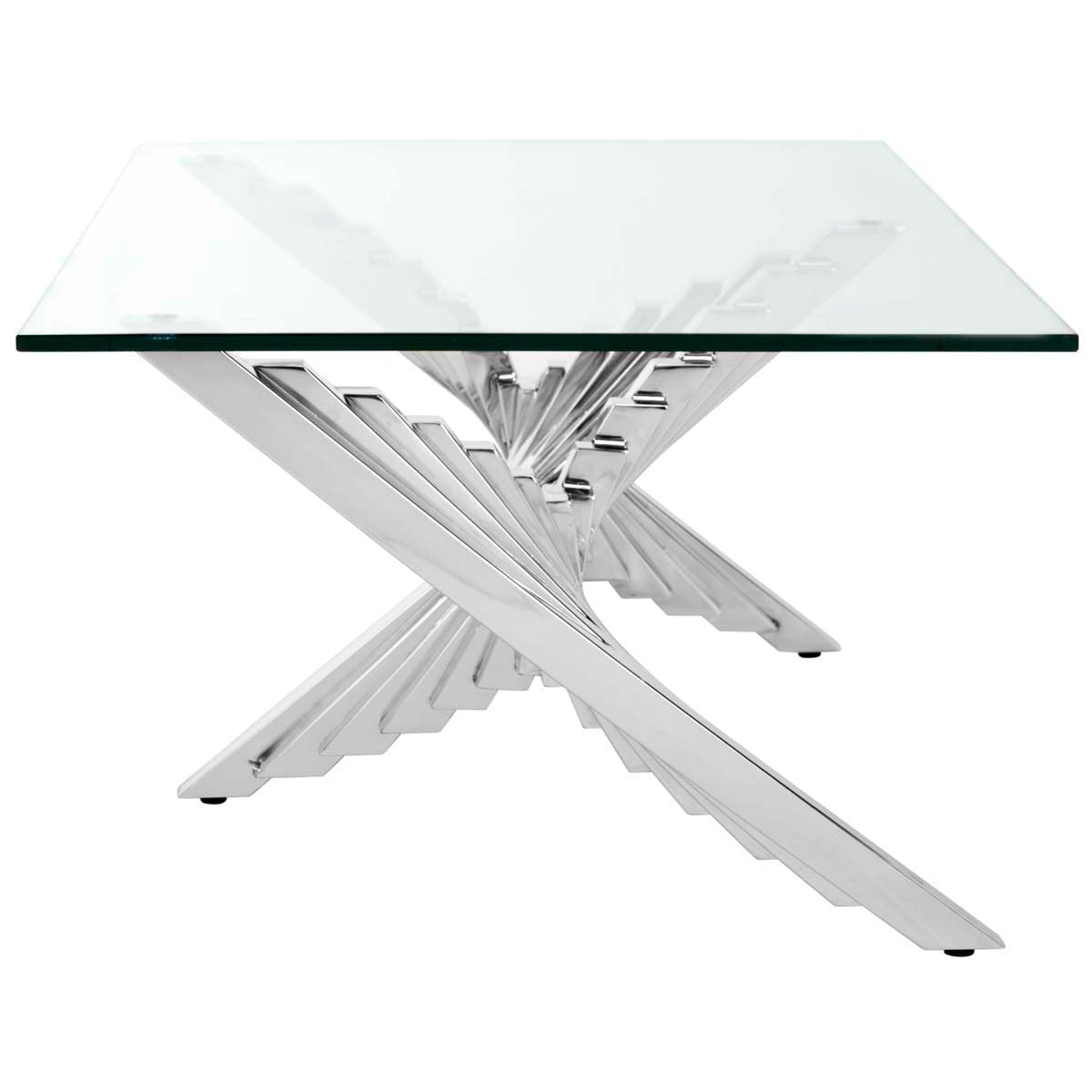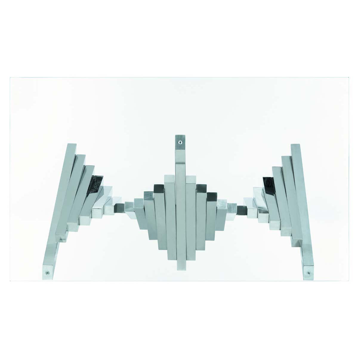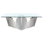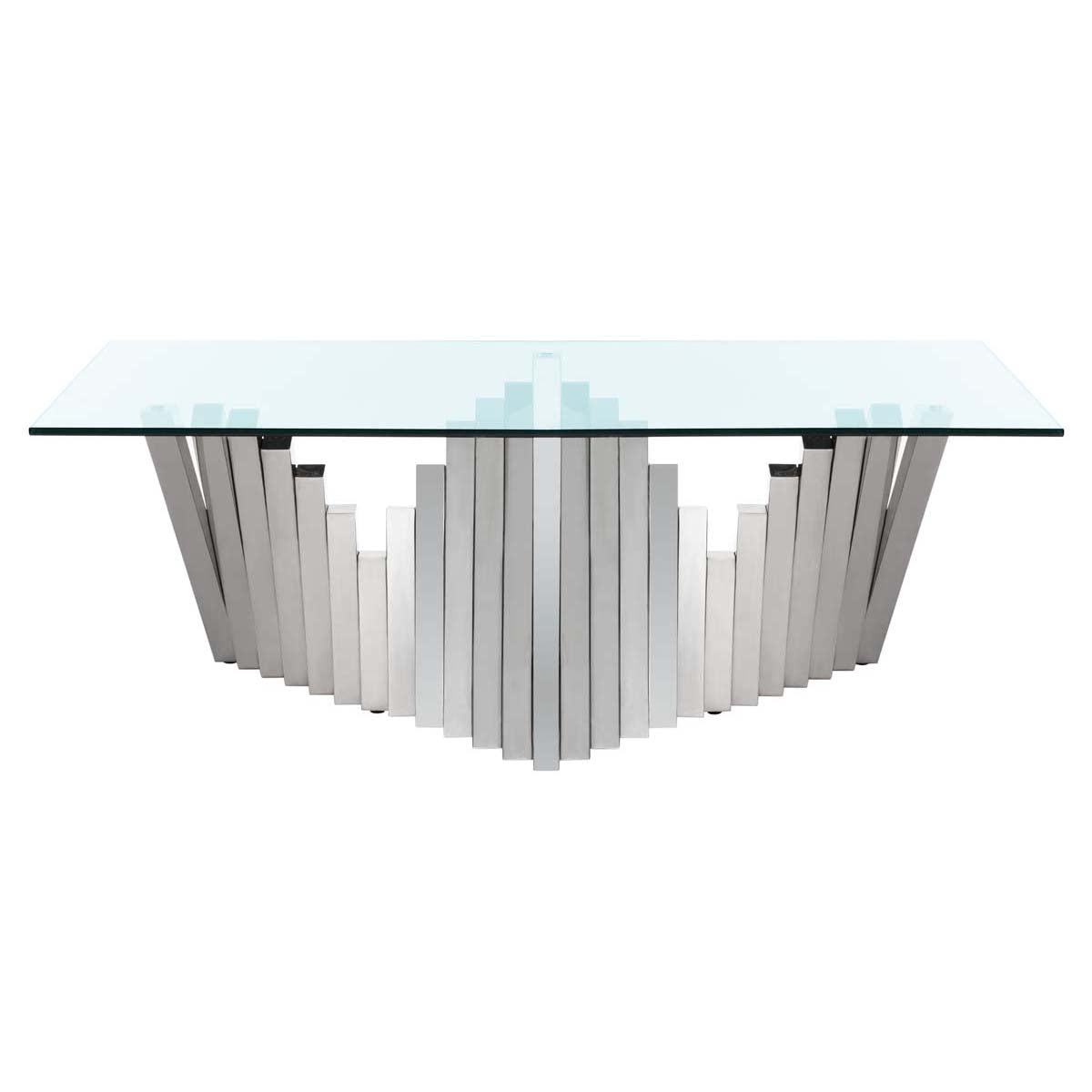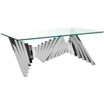 Inspired by iconic sculptures in London's modern art museum, this contemporary Metal Coffee Table is alive with scale and movement. Crafted with glass and silver finished polished stainless steel, it makes a grand artistic statement in any living room.