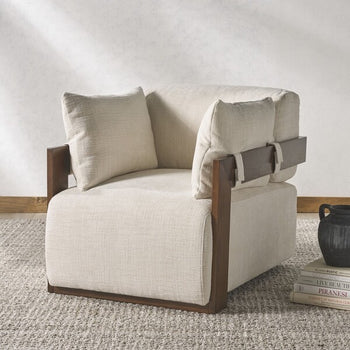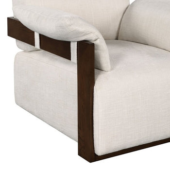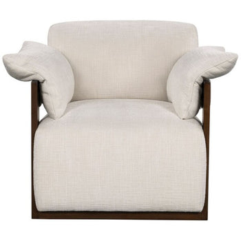 Bring inviting comfort and elegance to any corner with our charming Ivybella accent chair. Plush upholstery and mixed material elegance lend a casual yet elevated look to our accent chair. A clean-lined wooden frame, crafted in ash wood lends warmth and definition to the chair. Its plump back cushions and plush seat are complemented with feather padded, pillow top arms to create a perfect spot to sink in and relax. Upholstered in ivory-colored chenille, our cozy accent chair remains perfect for styling a lounge or family room or upgrading your bedroom reading nook.